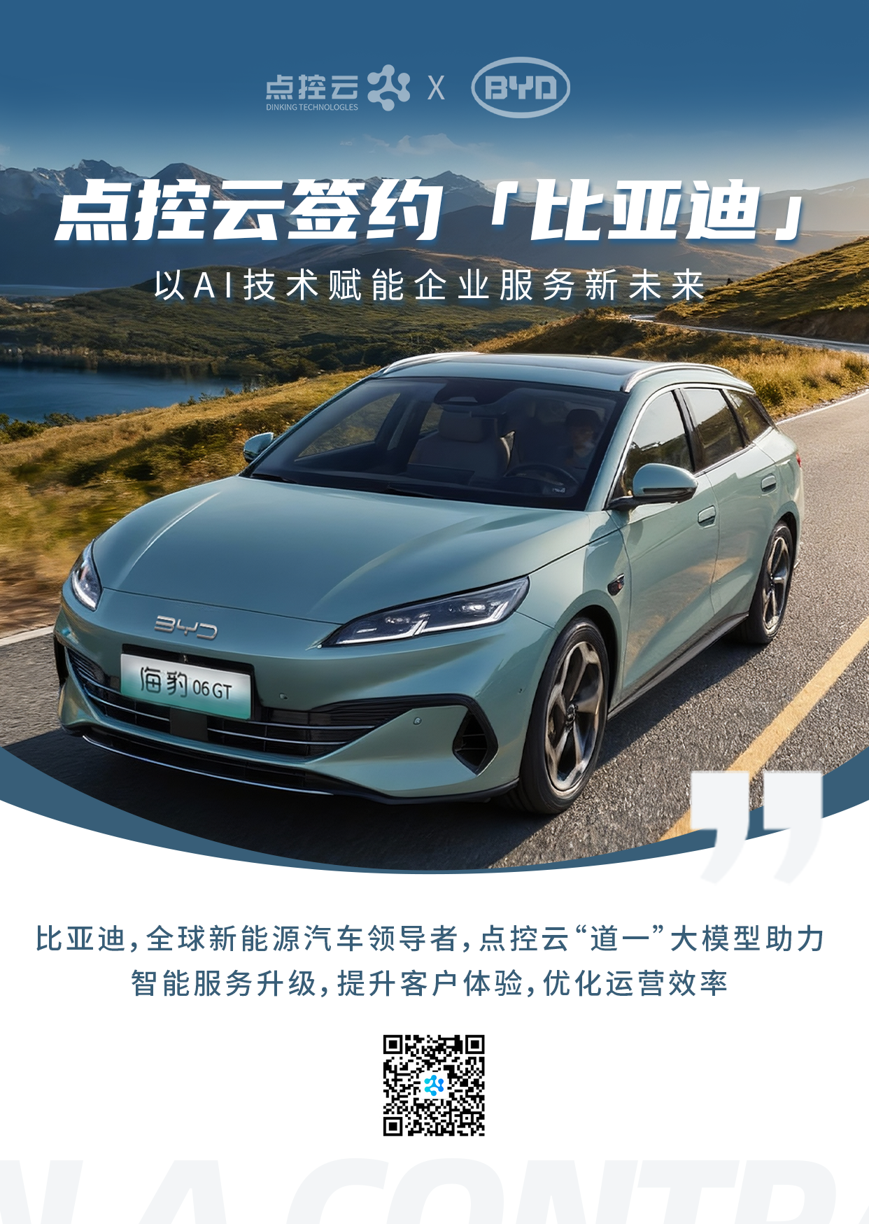 此次合作标志着点控云智能服务能力再次获得行业头部企业认可。凭借自主研发的“道一大模型” 与多场景智能体产品矩阵,点控云将为比亚迪提供覆盖客户沟通、服务体验、数据洞察 的全链路智能解决方案,助力比亚迪进一步提升客户体验与服务效率。