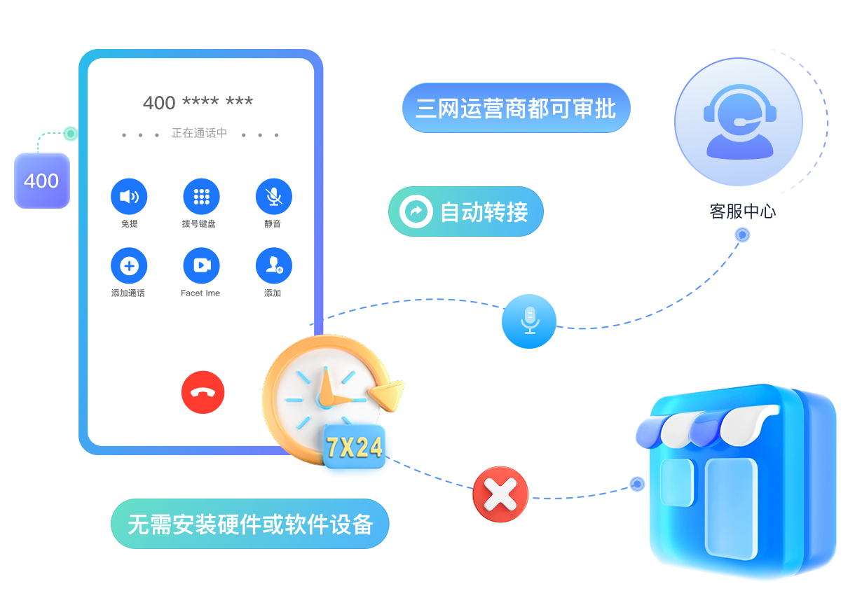 功能描述:400语音业务提供全国统一接入码,可以绑定原客服号码,无需额外硬件或软件设备,支持长期使用和灵活更换