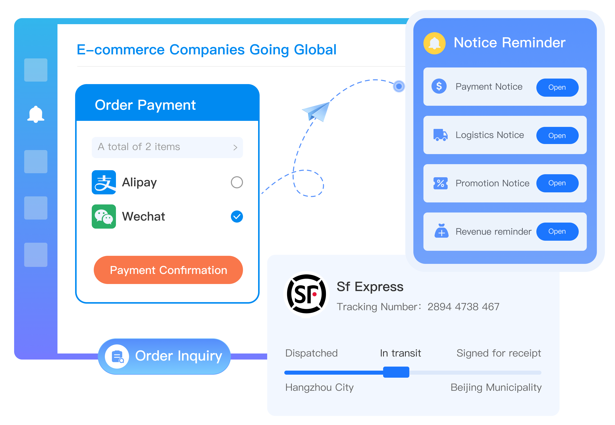 应用场景:用于订单确认、支付通知、支付保护、订单状态查询、物流信息通知、活动促销通知、账户收益提醒等