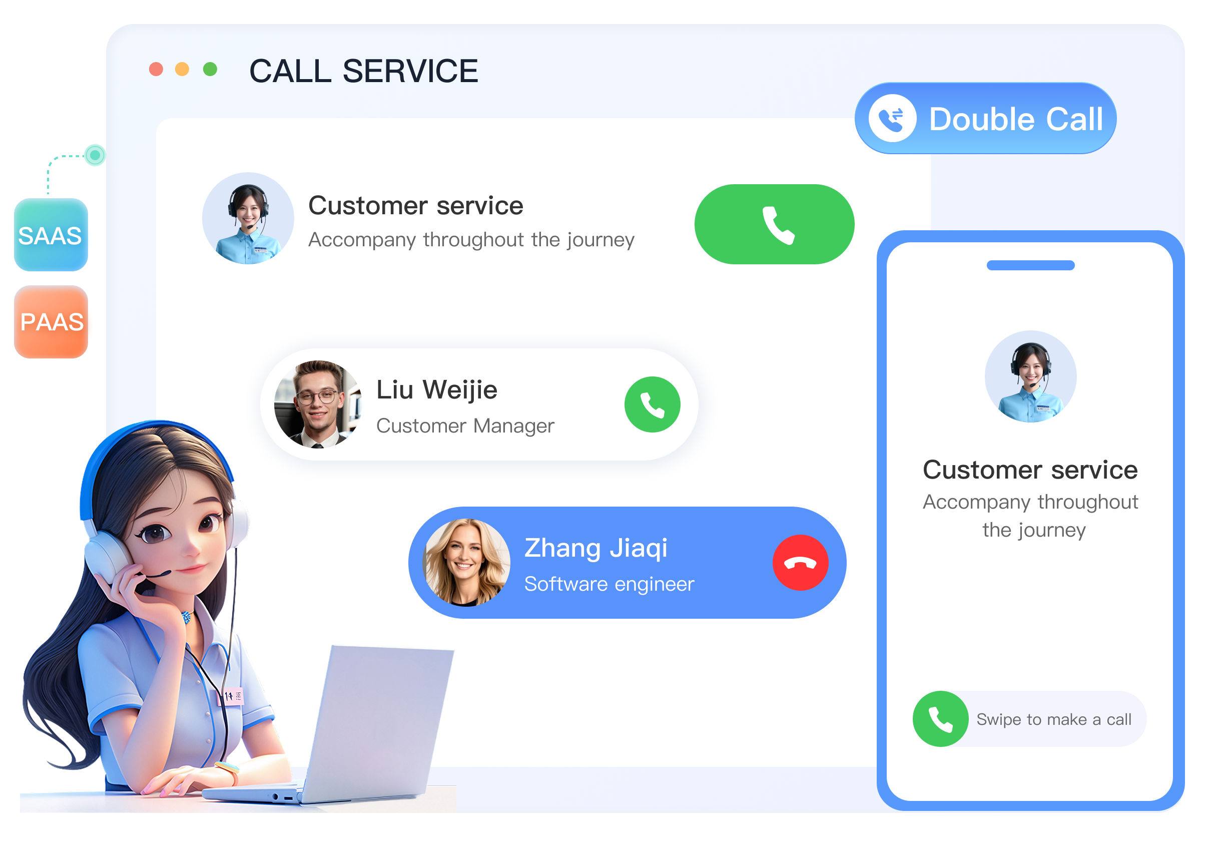 功能描述:提供SAAS、PAAS呼叫服务能力,支持座席外呼、网站嵌入、APP双呼、APP集成SDK呼叫等多种方式