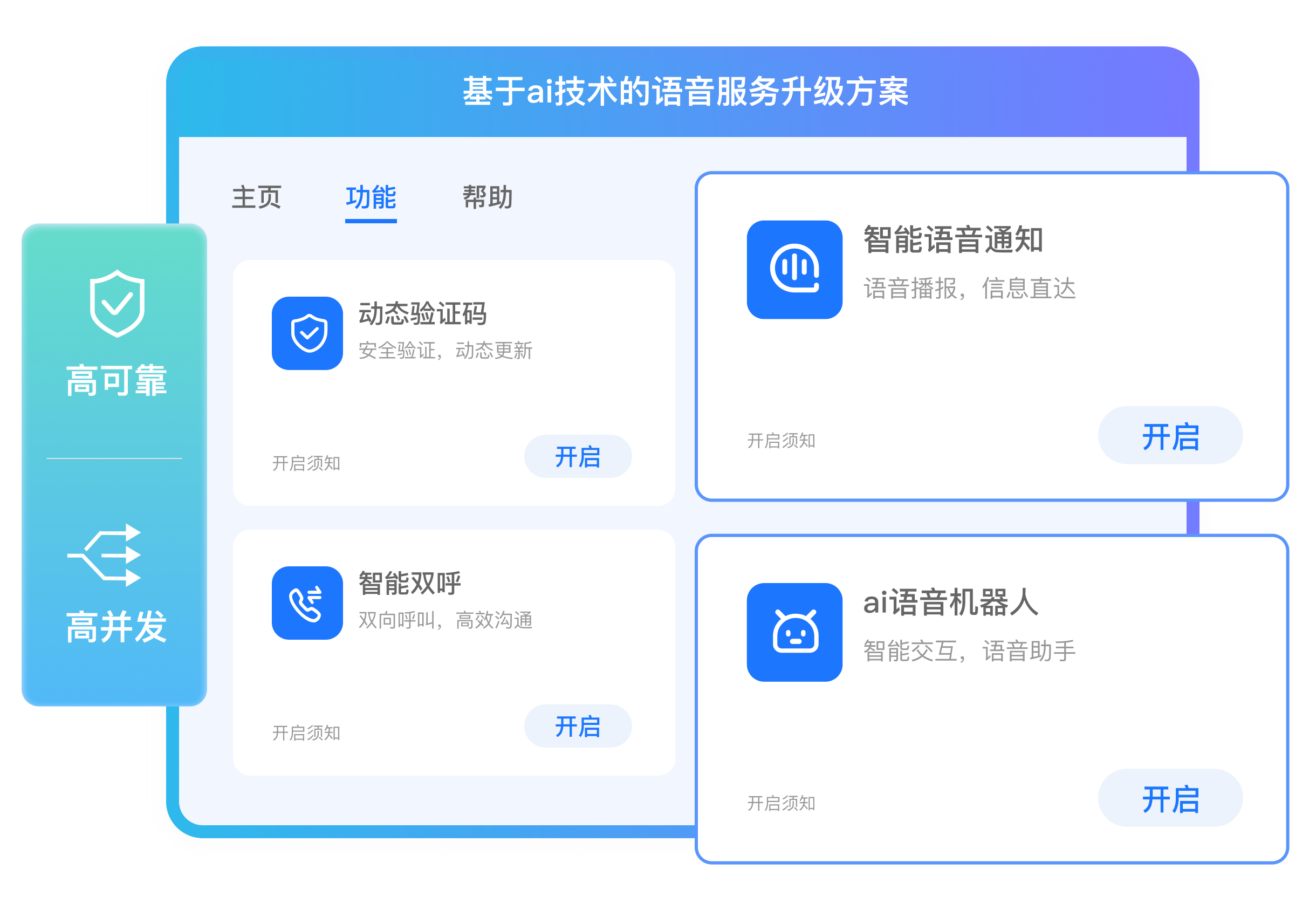 功能描述:基于AI的语音服务升级,为企业提供智能语音通知、动态验证码、智能双呼、AI语音机器人,增智能语义分析和自动化决策