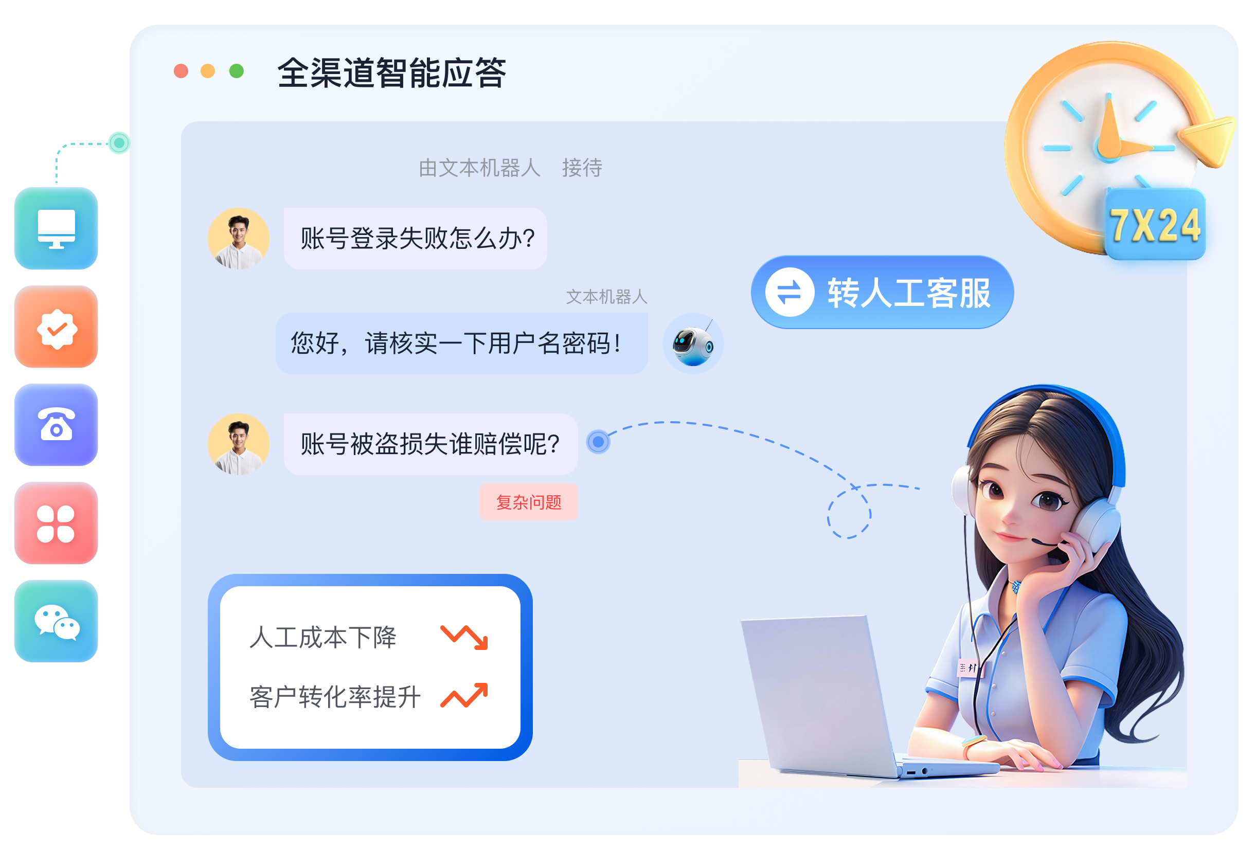 智能客服机器人自动处理80%的常见问题,复杂问题转人工座席核心优势:7x24小时服务:智能客服全天候响应,减少人工成本