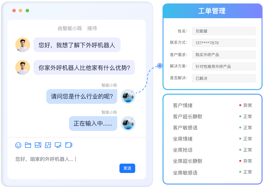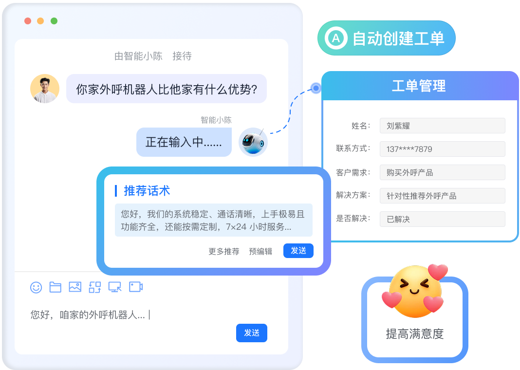 根据客户心声、情绪、意图完成更拟人、更专业的留资引导与客户服务,自动完成工单创建与流转,降低转人工率