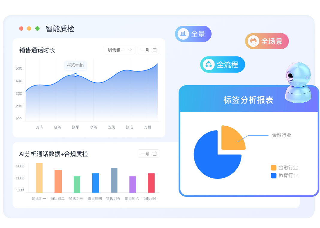 全量、全场景、全流程的智能质检系统,支持可视化运营报表、标签分析报表、客户分析报表等。帮助提供内容全面、直观且清晰,为企业的运营决策提供有效数据支持