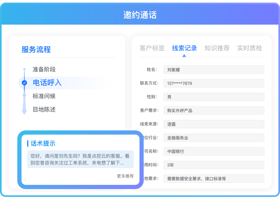 在沟通过程中,智能识别座席当前服务场景,为座席提供标准业务流程,推送优质话术作为参考
