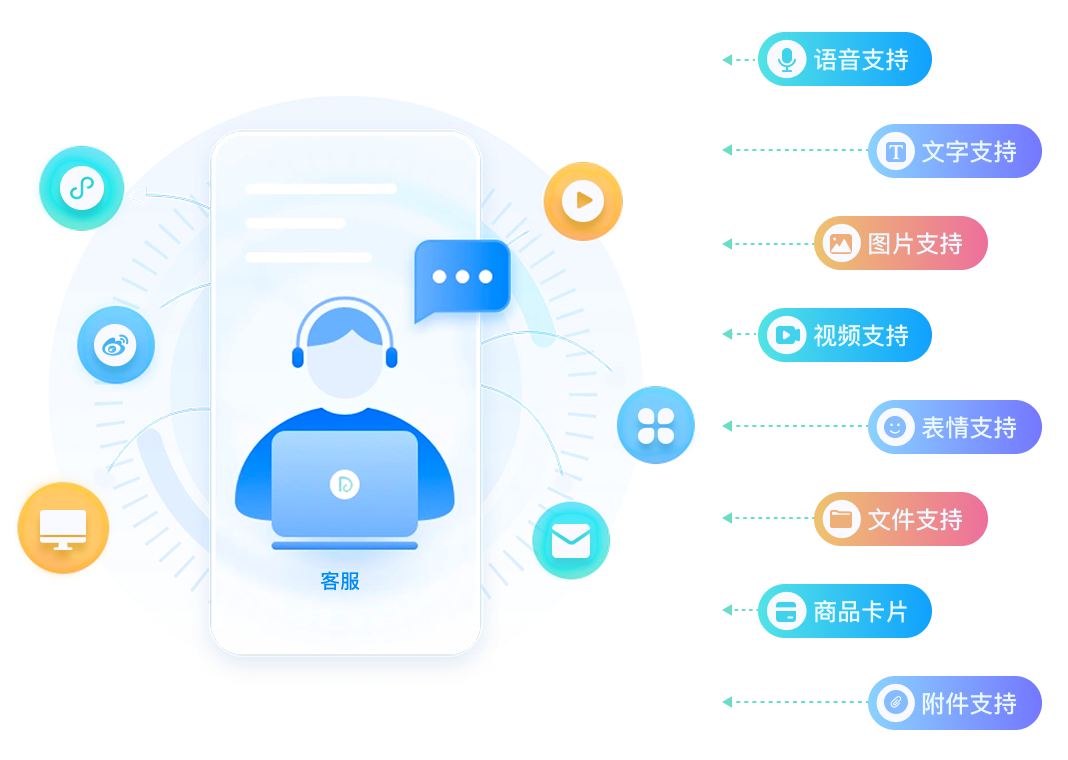 系统支持语音、文本、图片、视频、表情、附件、图文传输、商品卡片等多媒体交互,提升客户与企业的沟通体验